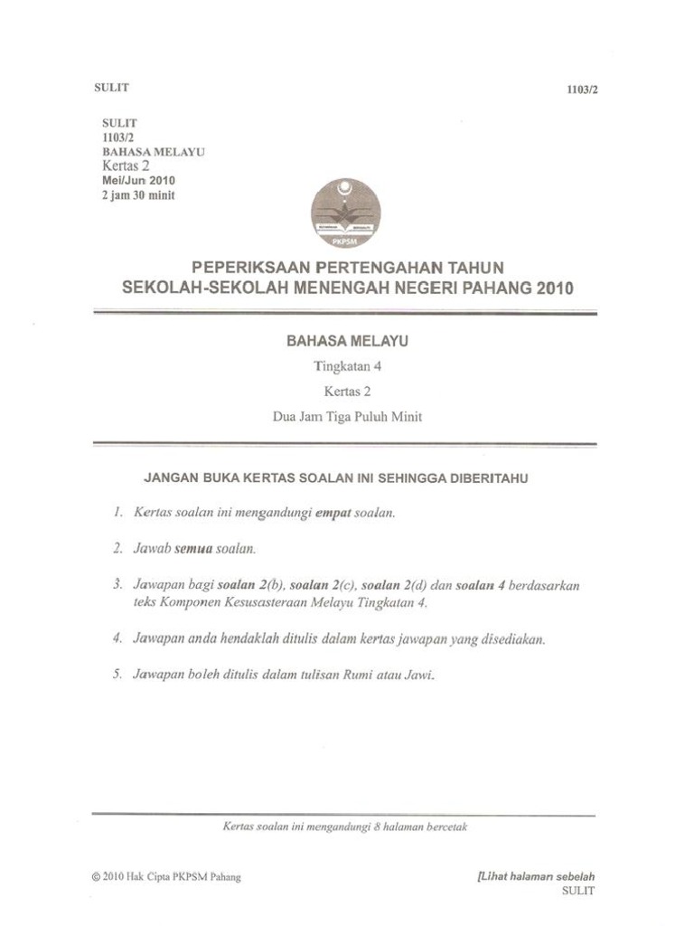 Bahasa melayu 1 tingkatan 2 1 jam. Bahasa melayu kertas 1 peperiksaan pertengahan tahun tingkatan 5 2011. Please fill this form, we will try to respond as soon as possible. Mata pelajaran bahasa melayu merupakan subjek teras dalam peperiksaan spm. Dskp kssm bahasa melayu tingkatan 4 dan 5. Jawapan bagi soalan 2(b), soalan 2(c) dan soalan 2 (d) berdasarkan teks komponen. 1 bahasa melayu tingkatan 4 / tingkatan 5 karangan. Sekiranya diizinkan allah, saya akan cuba mengulas kehendak soalan kertas bahasa melayu 1 spm 2018 sebagai usaha untuk membimbing pelajar tingkatan 4 smk seri londang bersedia. Jangan buka kertas soalan ini sehingga diberitahu 1. Forum ini akan digunakan untuk memberitahu berita terkini atau aktiviti semasa mata pelajaran bahasa melayu tingkatan 4. Nota ringkas bahasa melayu tingkatan 2 untuk semua pelajar. Ujian penulisan bahasa melayu tahun 3 via www.slideshare.net. Ujian mac bahasa melayu tahun 4~kertas 1.