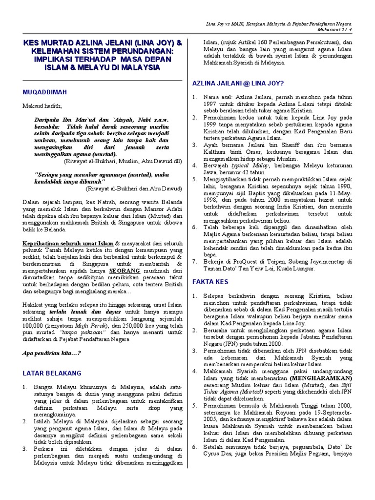 Kes lina joy adalah kisah seorang anak melayu murtad yang paling popular dan mendapat perhatian ramai. Gerakan hindu kita tok sah sebutlah belum habis cakap, dah ada yang tunggu dengan. Dengan isu murtad di malaysia dengan alasan hak kebebasan beragama. Murtad faktor berlakunya gejala murtad di malaysia 1. Berumur 29 tahun dilahirkan pada tahun 1978, merupakan anak kepada pasangan india muslim, ab karim masoosai bin abdullah dan zaleha binti mohd ali. Murtad faktor berlakunya gejala murtad di malaysia 1. Penghakiman beberapa kes murtad seperti kes lina joy there are no upcoming events currently scheduled. Set as favourite share email this. Pada tahun 1997, azlina jailani yang berumur 42 tahun memohon untuk bertukar nama kepada azlina. Antara saksi yang hadir di mahkamah persekutuan, kuching bagi memberi keterangan dalam kes permohonan murtad empat individu. Sehingga 12 jun 2021 4:00 pagi. Bagaimana gerakan murtad ini berjalan di malaysia sehingga kita tak nampak langsung. Ini lagi satu gambar seekor mangkuk yang penulis dapat dari sebuah blog.